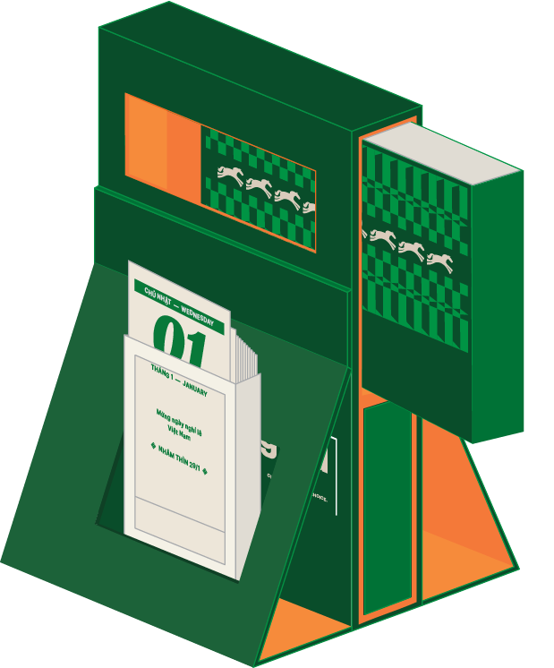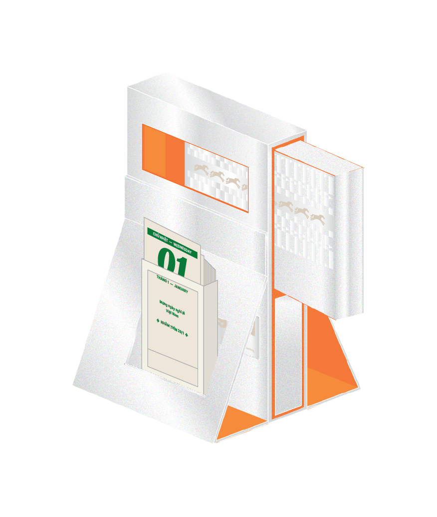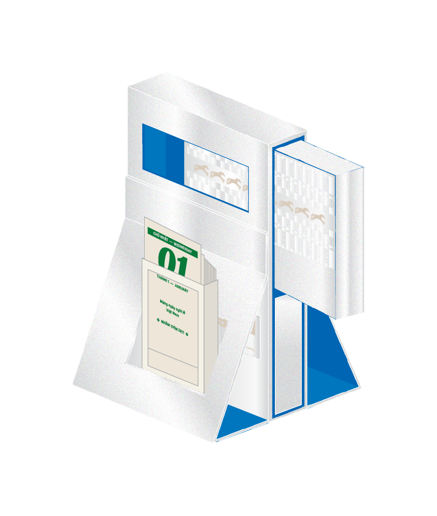 Thiết kế hoàn toàn khác biệt – không trùng lặp với bất kỳ mẫu lịch nào trên thị trường. Mỗi bộ lịch là một tác phẩm nghệ thuật, kết hợp giữa mỹ thuật Việt Nam và tinh thần hiện đại.